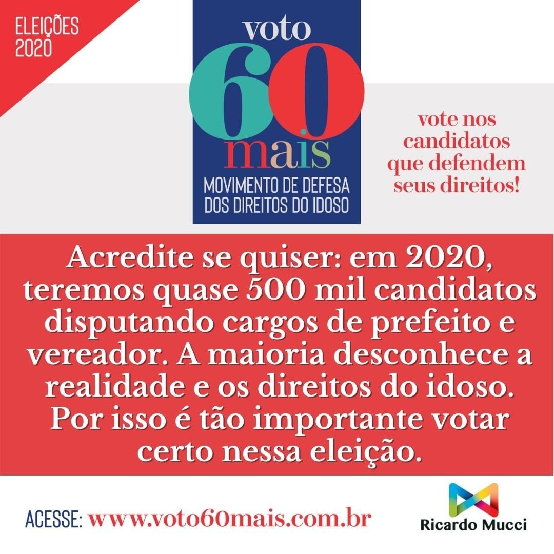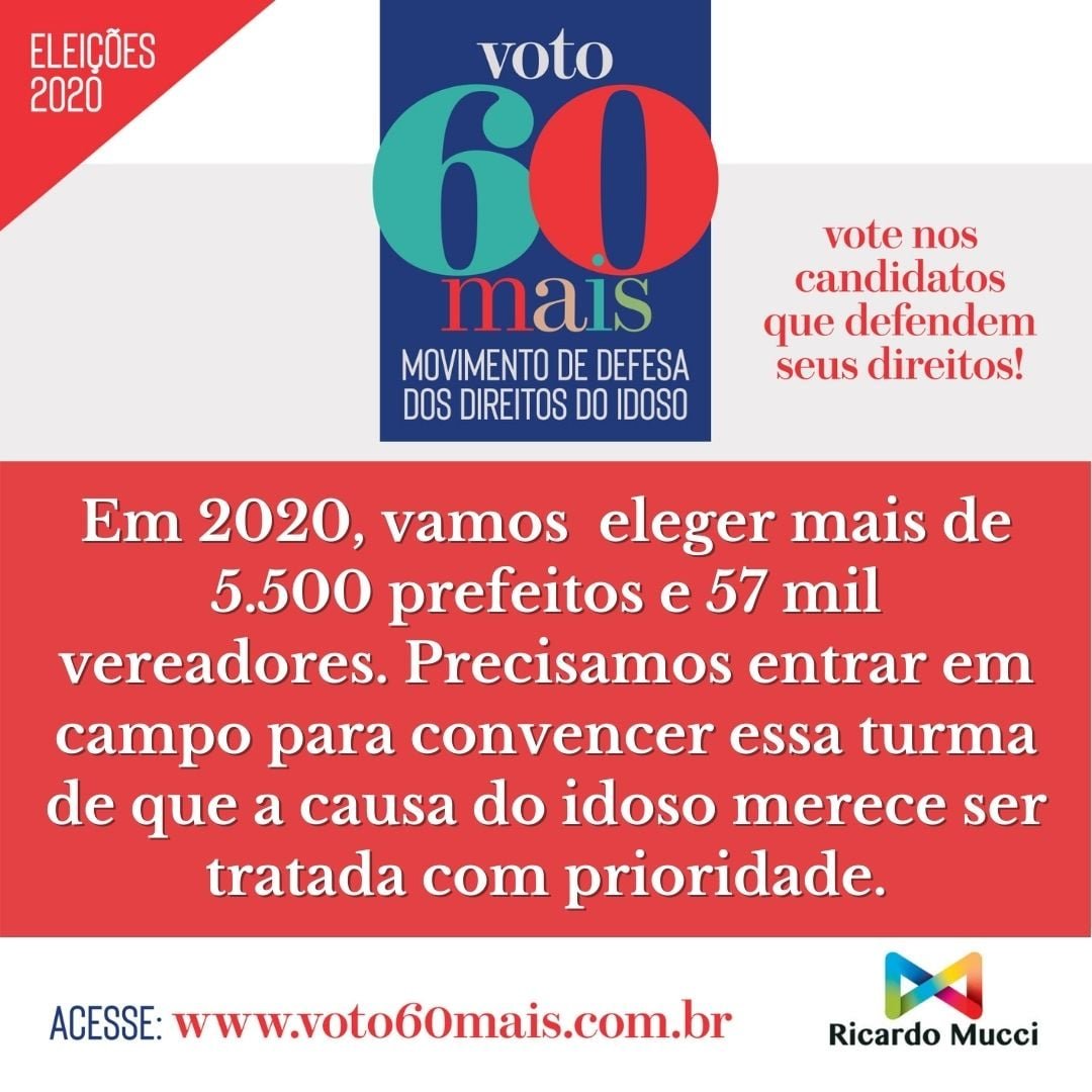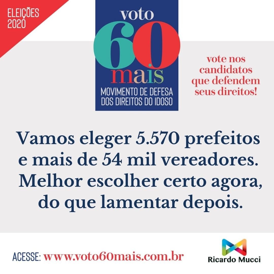 As Eleições Municipais de 2020 vão renovar o mandato de 5.570 prefeitos e mais de 56 mil vereadores. O total de candidatos que irão disputar as eleições de novembro será superior a 460 mil. É uma ótima oportunidade para escolher representantes comprometidos com a causa do idoso no Brasil.