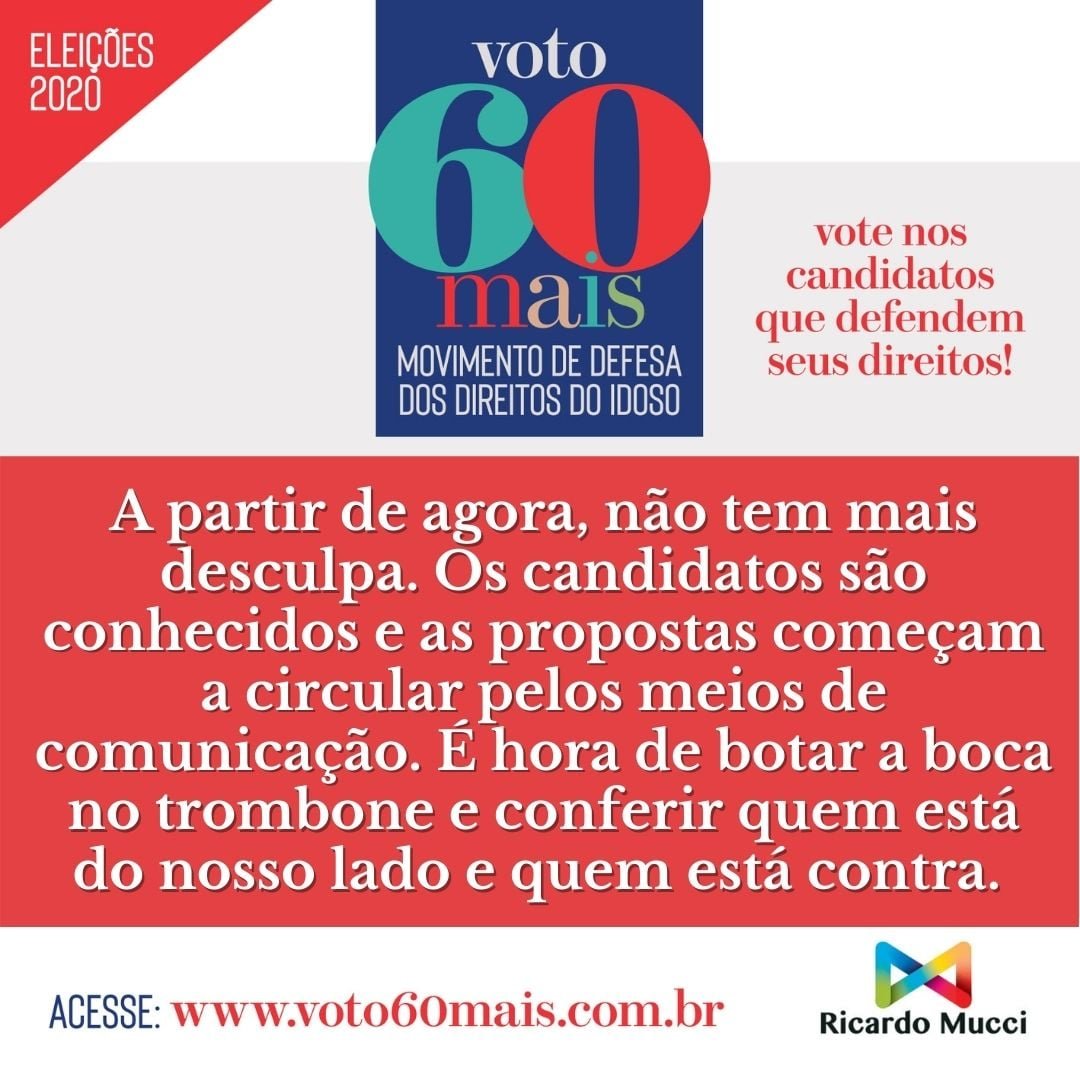 O Movimento Voto60+ é uma ação institucional gratuita criada pelo jornalista, pesquisador e comunicador Ricardo Mucci, que está aberto a todas as pessoas, empresas, organizações, governos, partidos e candidatos que queiram apoiar a causa. Basta enviar um e-mail para o endereço abaixo, expondo as razões de seu apoio e, prontamente, irá receber cópia do material de divulgação, onde é possível incluir nome, marca ou a denominação de sua instituição, que formaliza sua adesão oficial ao movimento.
